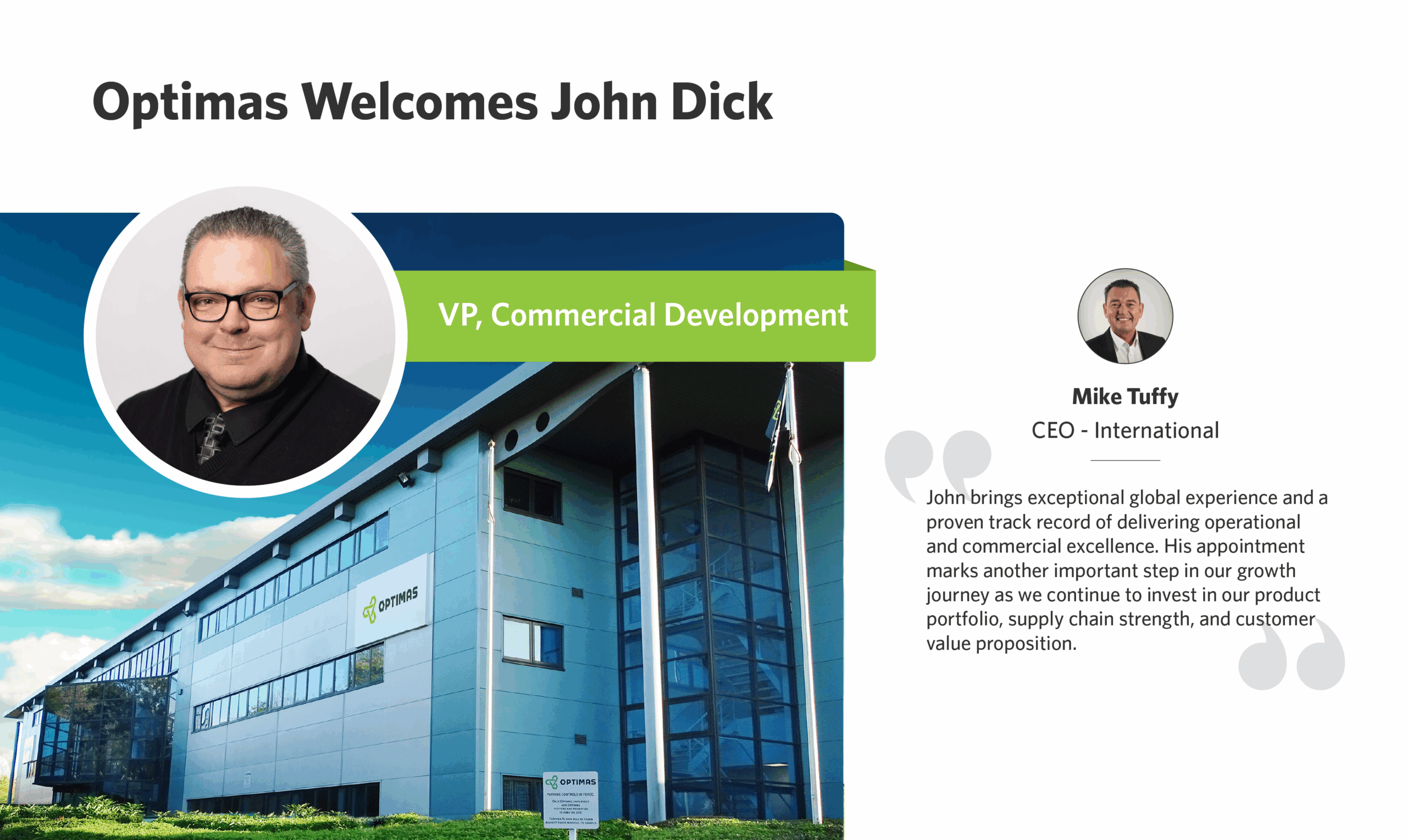 Optimas is pleased to welcome John Dick as Vice President, Commercial Development. This senior leadership role is focused on accelerating our international commercial strategy and supporting full alignment with our product-led, supplier-led, and customer-led growth ambitions.